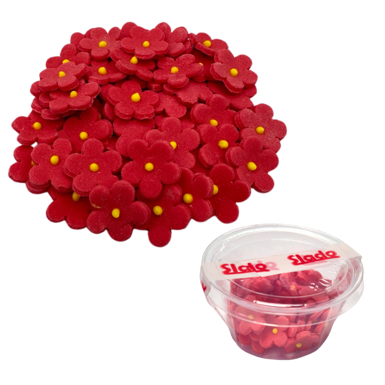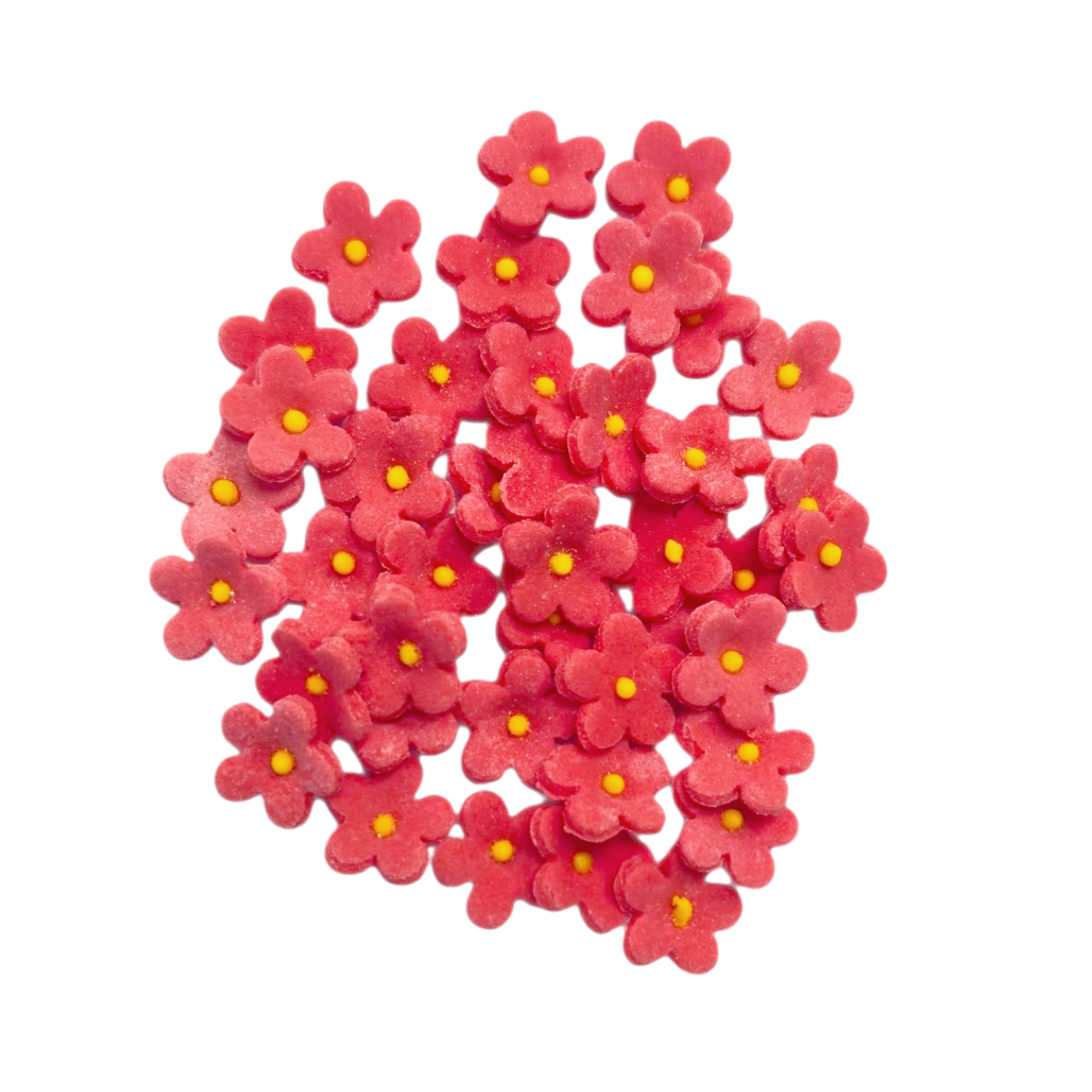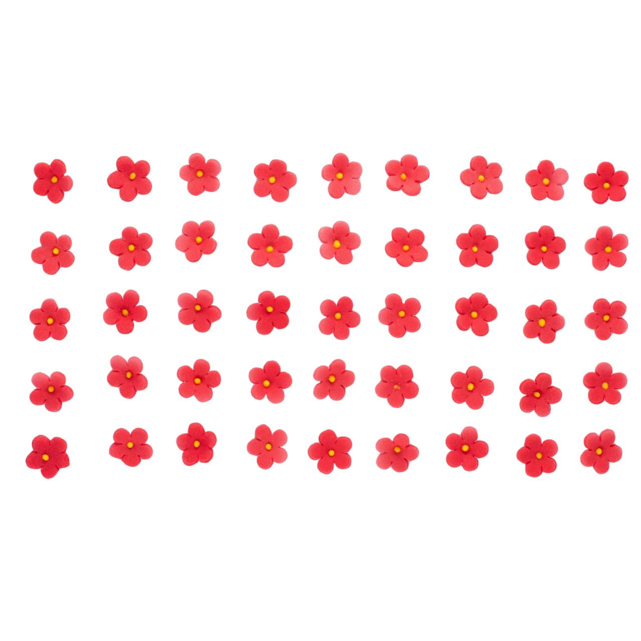 Zestaw „Cukrowe kwiaty jabłoni (czerwone)” składa się z wielu, bo aż z czterdziestu pięciu kwiatków! Tak duża ilość pozwala Wam stworzyć naprawdę każdą kompozycję. Nie musicie się więc hamować! Dajcie się ponieść fantazji i twórzcie według własnego pomysłu. Jak możecie zauważyć na zdjęciu powyżej, każdy kwiat ma czerwone płatki z żółtym środkiem. Tak uniwersalne dodatki będą się ślicznie prezentować na każdym torcie, niezależnie od jego rozmiaru.