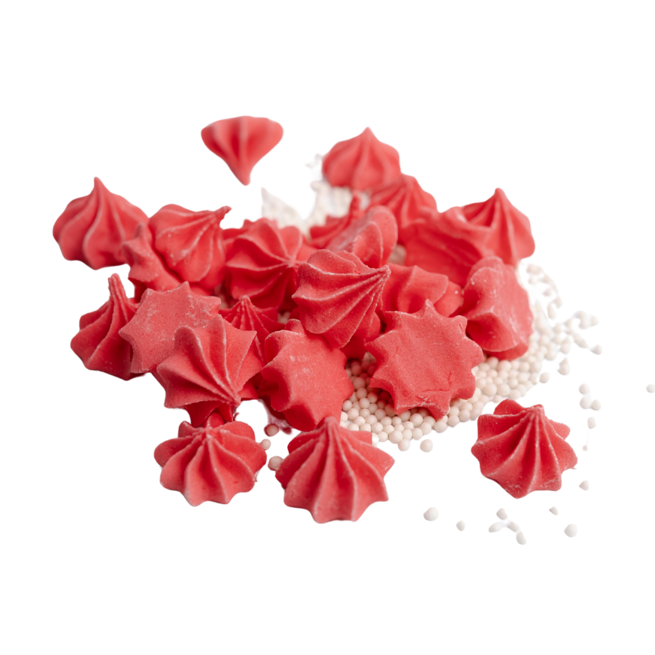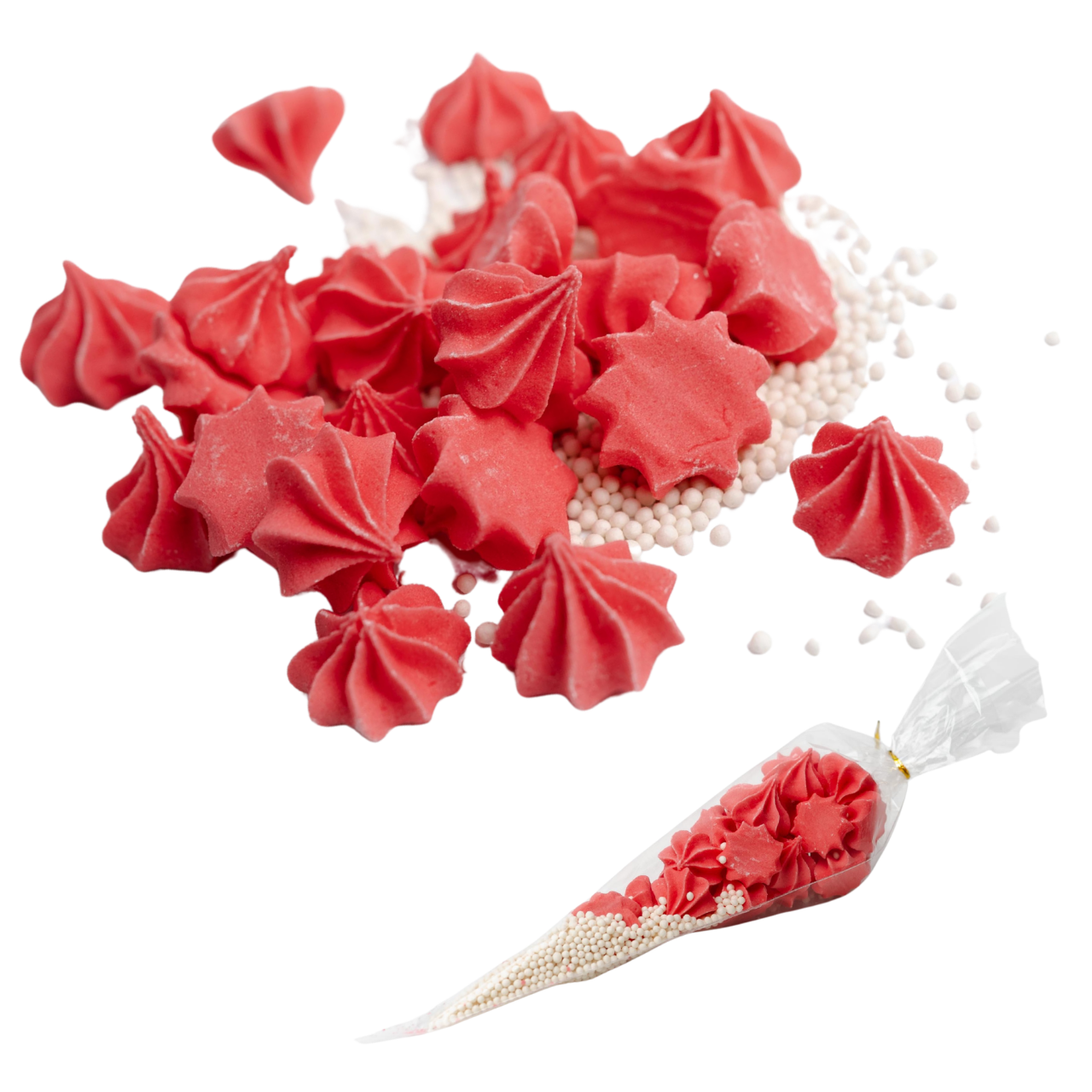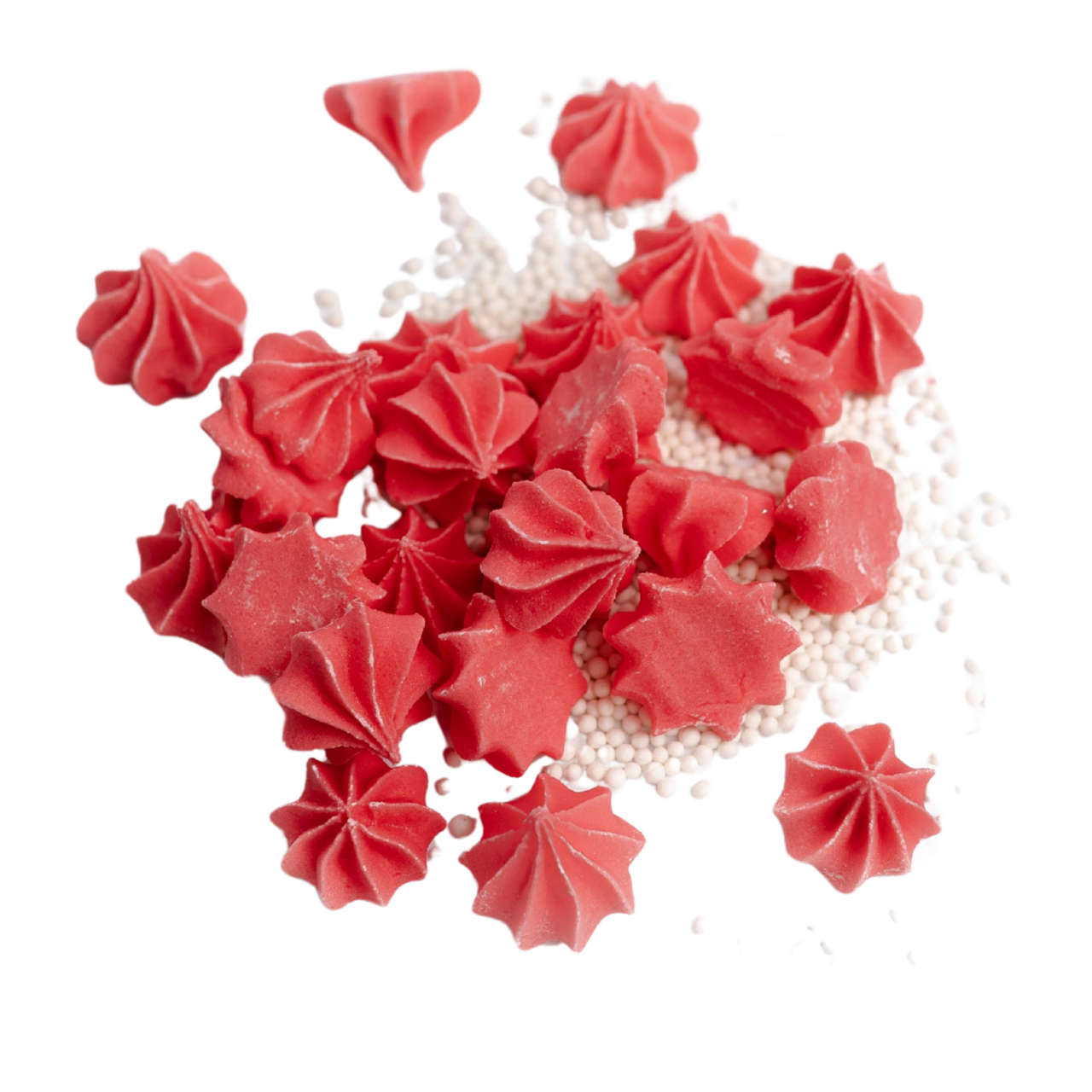 Składniki: Mini bezy: cukier, cukier, albumina jajeczna (suszone białko jaja), regulator kwasowości: kwas cytrynowy (E330), substancja zagęszczająca: guma guar (E412), barwnik: pąs 4R (E124). Posypka: cukier, mąka pszenna, syrop glukozowy, substancja glazurująca: szelak (E904), olej kokosowy, etanol, substancja przeciwzbrylająca: talk (E553b).