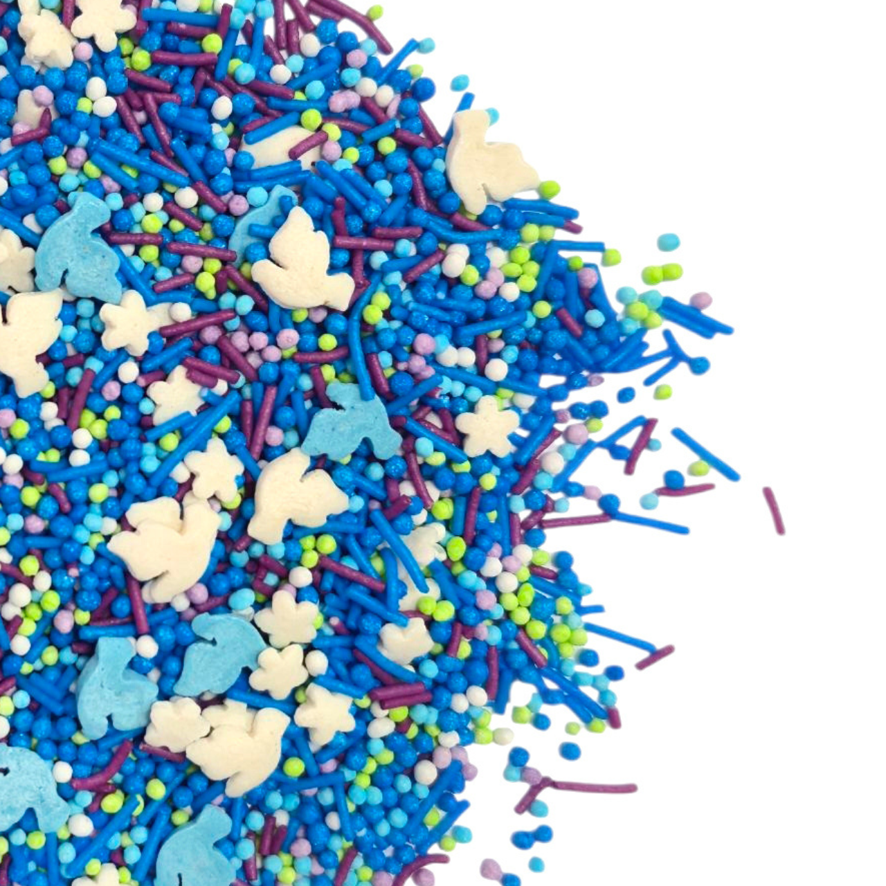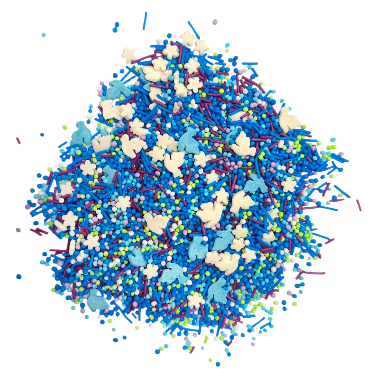 Ten rodzaj posypki to po prostu strzał w dziesiątkę. Ciężko opisać wszystkie jej elementy – jest ich naprawdę dużo! Możemy jednak wyróżnić przede wszystkim małe i duże kółka, pałeczki oraz tytułowe gołębie. Równie mocno co kształty wyróżniają się ich kolory. Cały zestaw nie prezentuje się jednak krzykliwie, a wręcz bardzo spójnie. Mimo panującej różnorodności możecie spokojnie używać wszystkich jego elementów dekorując jeden wypiek.