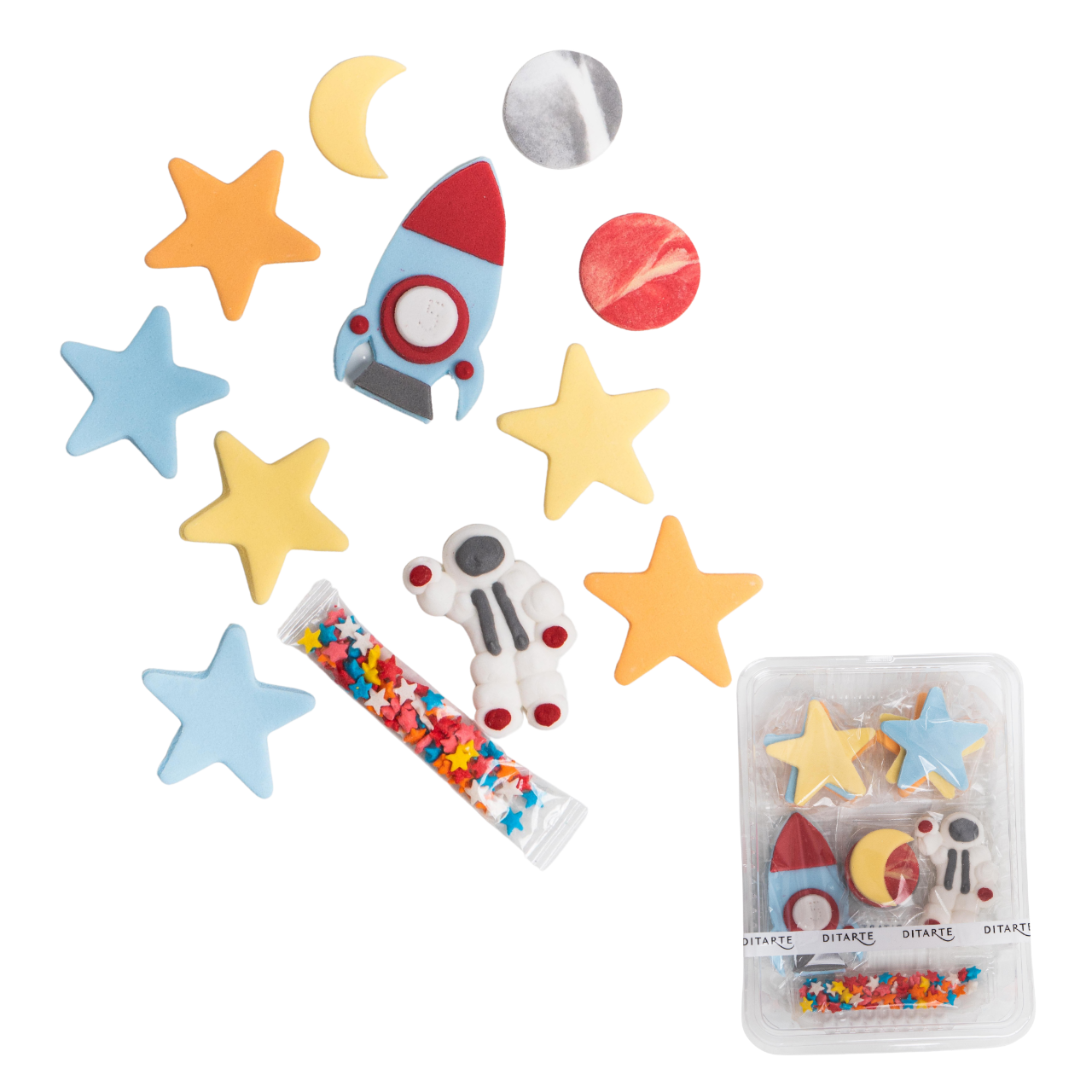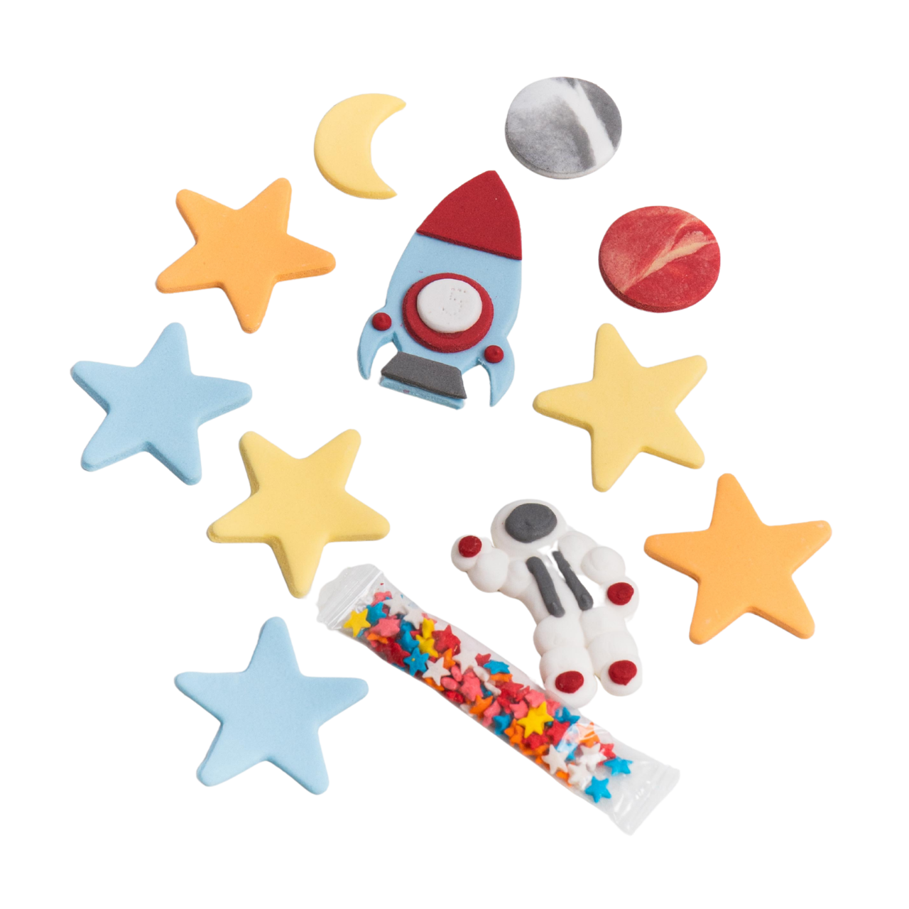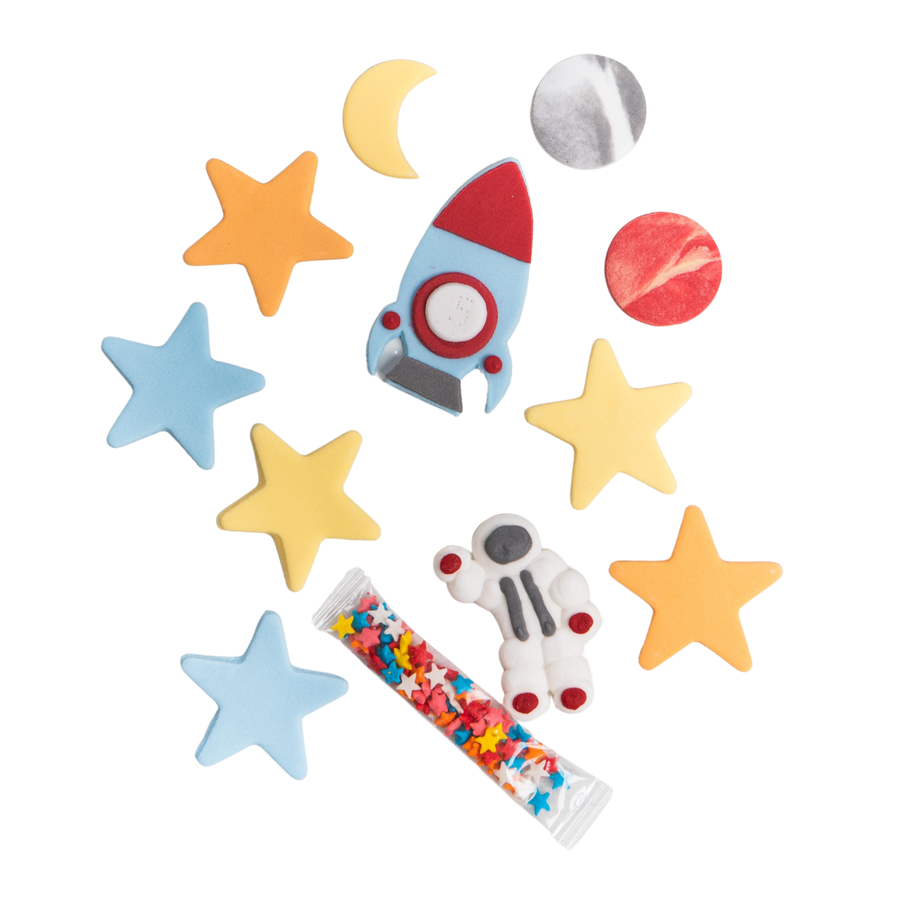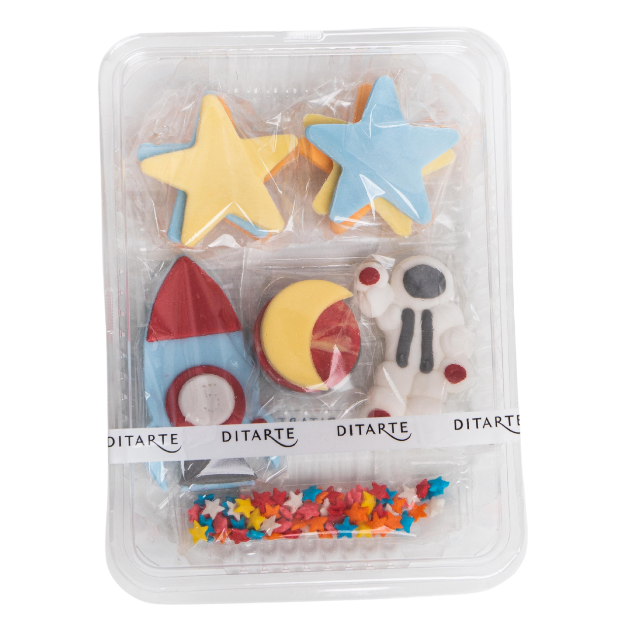 Zestaw dekoracje cukrowe: Kolorowy kosmos to jeden z ciekawszych sposobów na dekorację słodkich wypieków. Został zachowany w tematyce kosmosu i składa się z 12 kolorowych elementów, które pozwolą odbyć lot na inną planetę. Nasz zestaw kosmicznych figurek cukrowych będzie wspaniałym elementem przyjęcia urodzinowego dla dziecka lub dorosłego, zwłaszcza jeśli fascynuje go taka tematyka. Możesz nimi ozdobić tort, ciasta, babeczki lub desery. Wszystko zależy od Twojej pomysłowości!